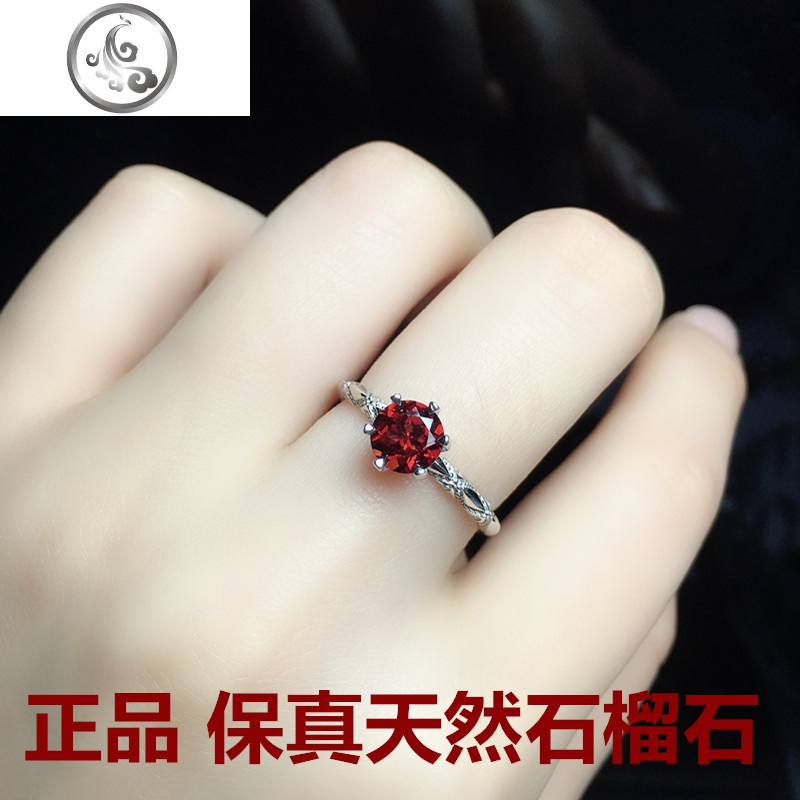 天然石榴石戒指女S925纯银镶嵌红宝石水晶开口...