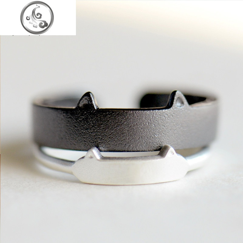 原创黑猫白猫情侣戒指一对纯银男女对戒子日韩简约...